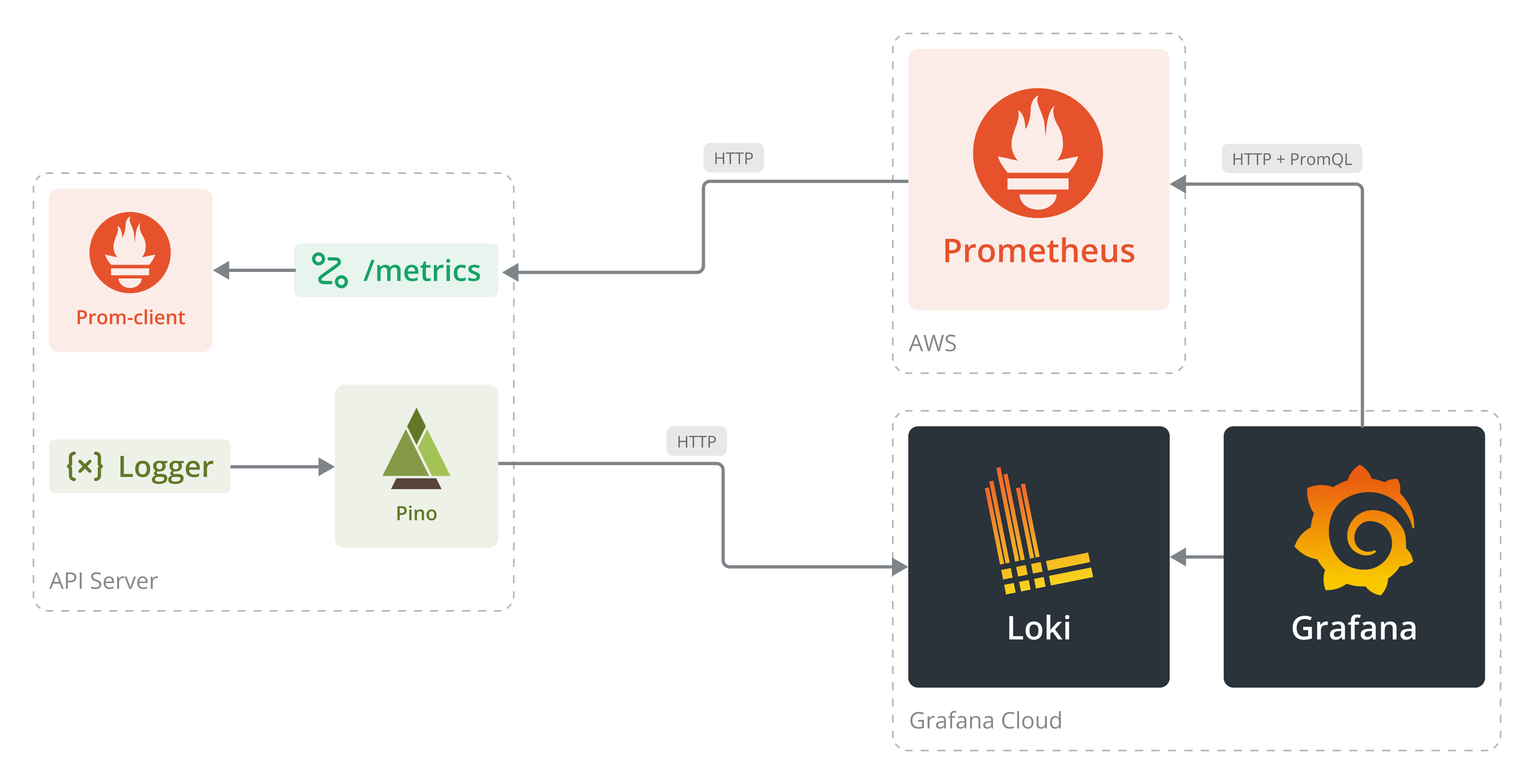 Todas estas condiciones las podemos cumplir con un grupo de herramientas ya existentes: Grafana, Loki, Pino y Prometheus. Veamos en detalle para que sirve cada una y como encajan en nuestra solución.